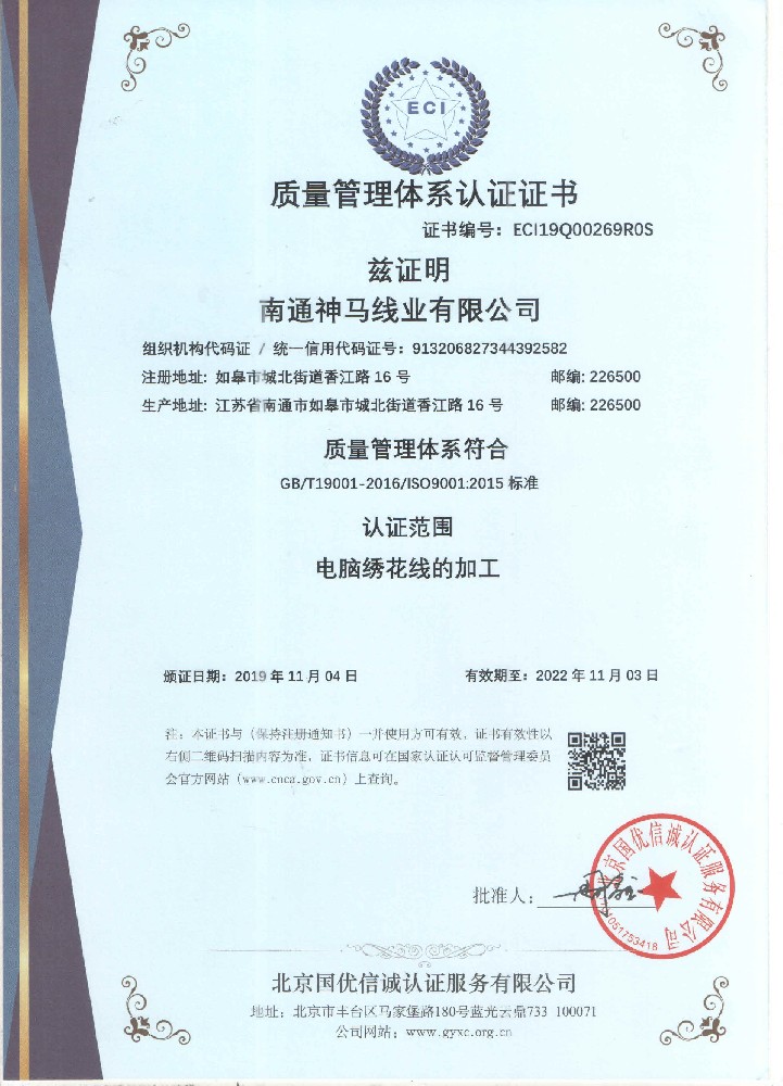 质量管理认证证书中文版2019